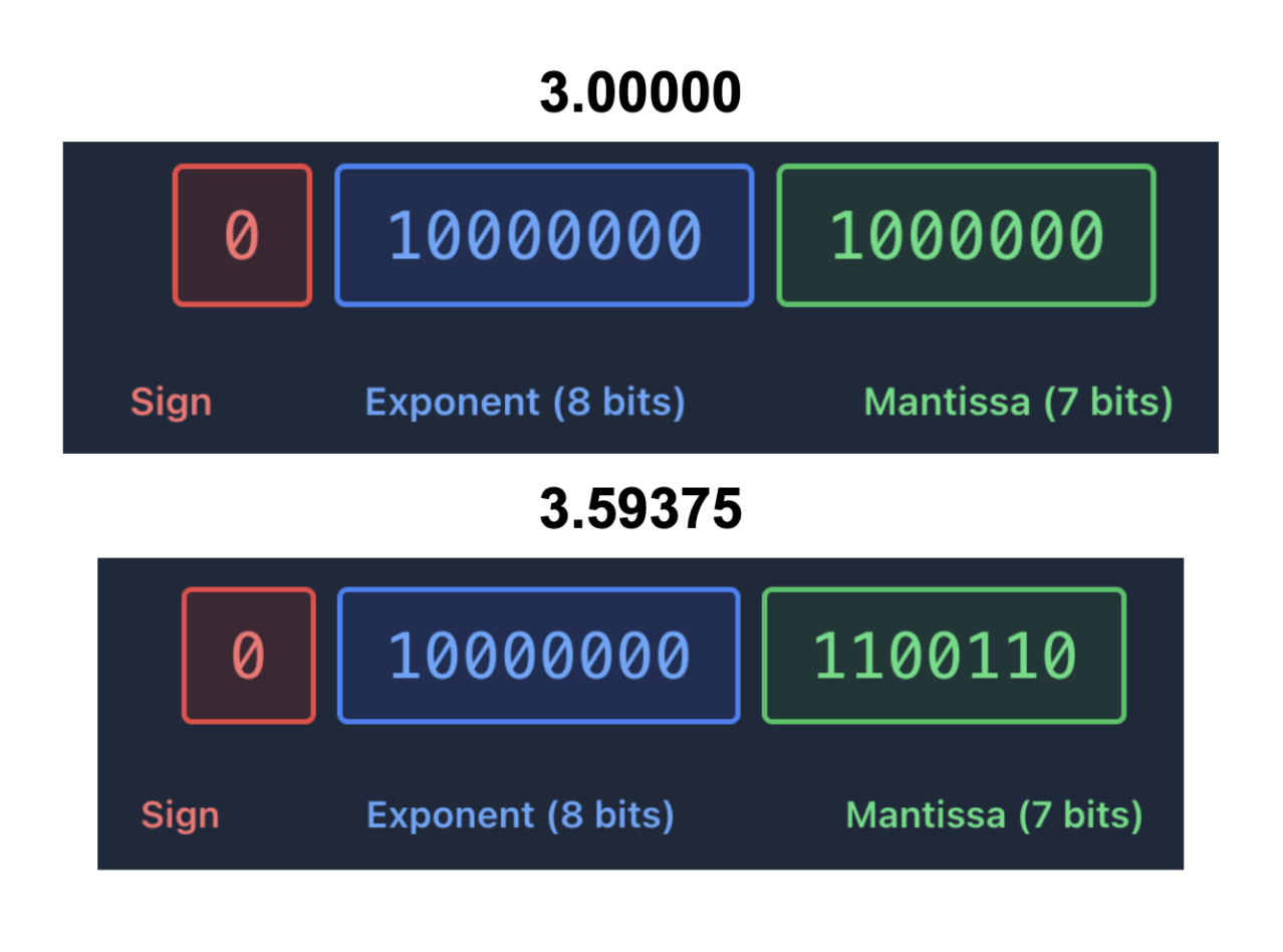 Each of these components are represented as integers and suffer from the exact same rounding errors you might expect. In bf16, the most commonly used representation for machine learning, 7 bits are dedicated to the mantissa. This is not very many bits! The value 3.0 can be represented exactly, but a value like 3.6 cannot…