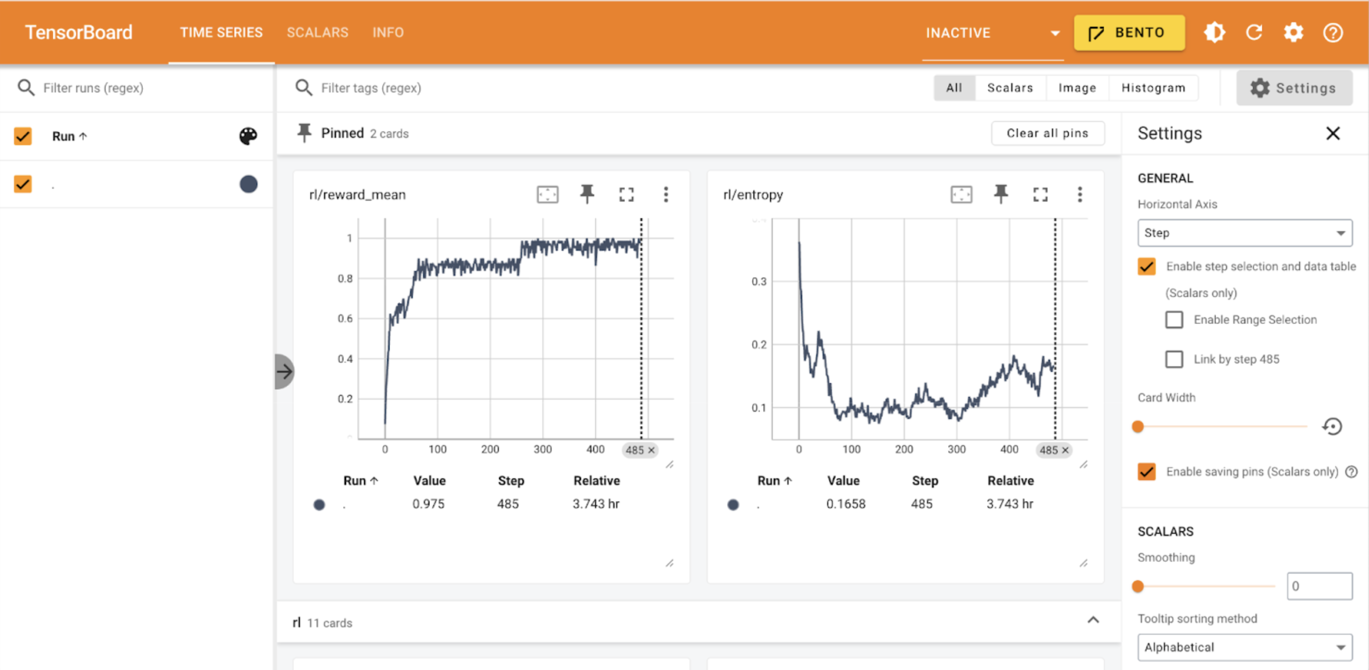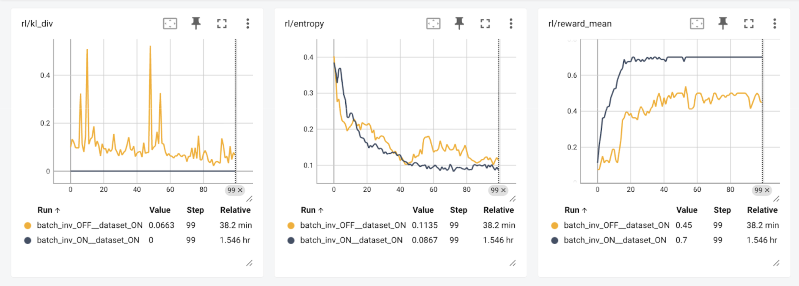 Running the demonstration associated with this blog post we see exactly the issue described below. Running the generator with different kernels than the trainer (batch_inv_OFF) shows a reduced reward over 100 steps. Enabling bitwise exact training, we see the model not only train in fewer steps, but reach a higher total reward!