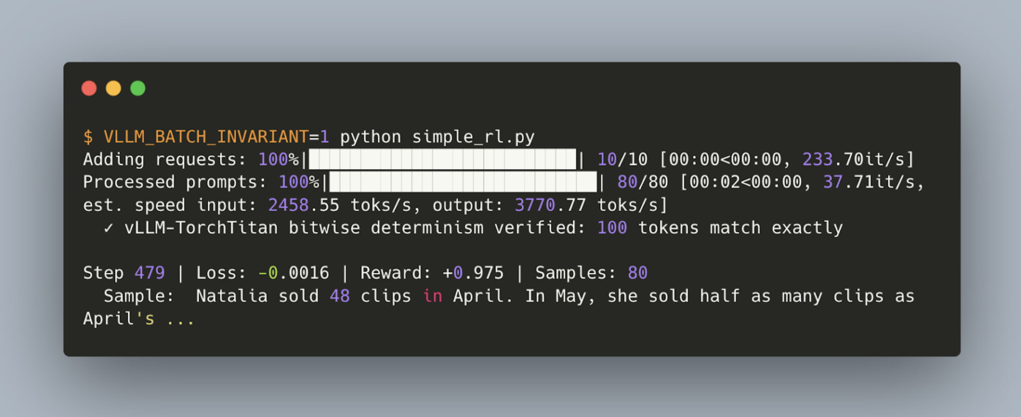 We tackled not only invariance in the same framework, but across two different frameworks. This was a challenging task as it required effectively auditing every single invocation of every kernel. We heavily leveraged the forward pass kernels from vLLM’s recent batch invariance work and wrote simple backward passes for these.