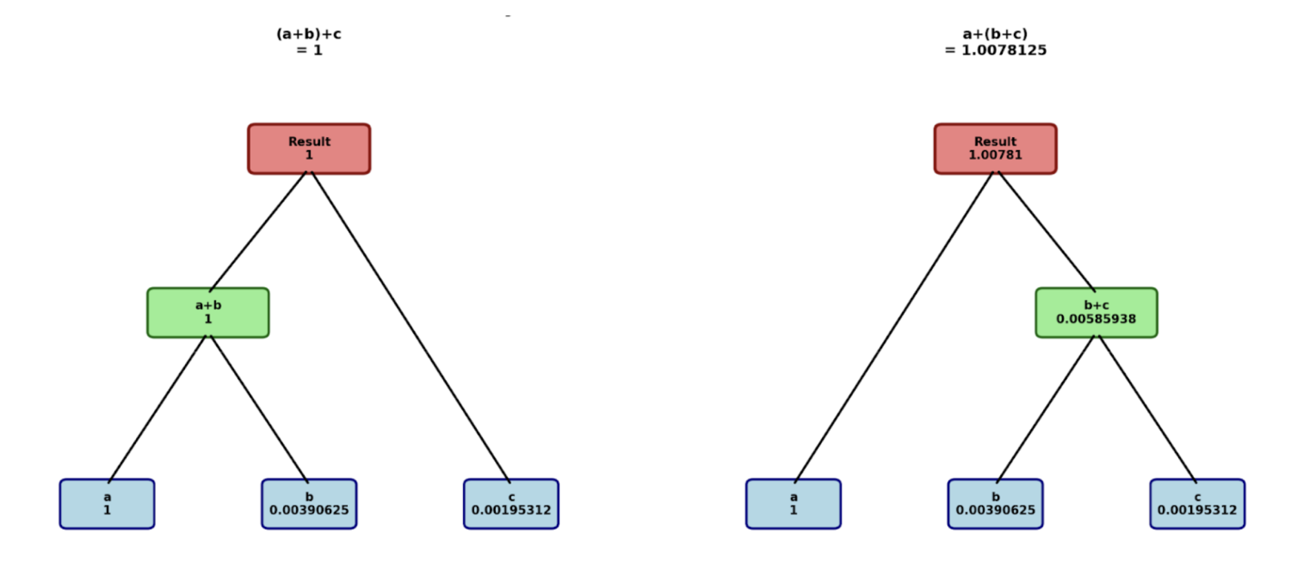 When you want a new value in bf16 you end up rounding it to the nearest available value. What’s of particular interest today is the implication of this rounding process happening at different points in a sequence of additions.